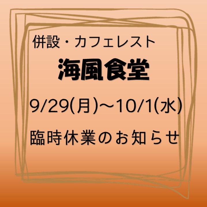 併設・カフェレスト【海風食堂】は9/29(月)~10/1(水)まで臨時休業となります。 お客様には大変ご迷惑をお掛け致しますが、ご了承くださいませ。 *+*+*+*+*+*+*+*+*+*+*+*+*+*+*+*+*+*+*+*+*+*+*+*+*+*+ 問い合わせ先/ 海風食堂 TEL:0880-82-5070 ジョン万次郎資料館 TEL:0880-82-3155 *+*+*+*+*+*+*+*+*+*+*+*+*+*+*+*+*+*+*+*+*+*+*+*+*+*+