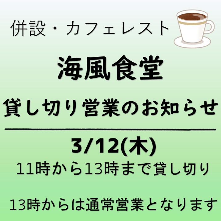 カフェレスト「海風食堂」は11時から13時までは貸し切り営業となります。