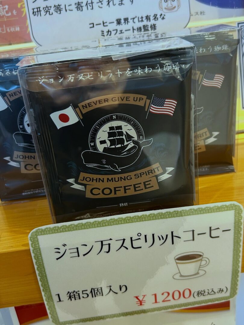 「ジョン万スピリットコーヒー」販売中です! ~コーヒー業界では有名なミカフェート様監修~ ご来館の記念やお土産にもおすすめです お立ち寄りの際は、ぜひご覧ください (ジョン万スピリットコーヒーの収益の一部は、ジョン万次郎の資料保存や研究等に寄付されます。)